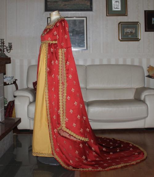 Abito con strascico realizzata in Damascato Bordeu' e Damascato oro per la sottogonna.