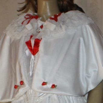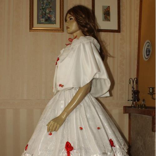 Abito composto da corpetto steccato in raso bianco con passamaneria in paillettes e balze lungo la scollatura in tulle bianco con ricami in fili argento. Applicazione di rose in nastro rosso eseguite a mano.