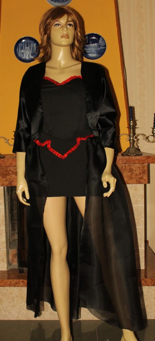 Abito realizzato in gambardine nero. composto da corsetto steccato con chiusura posteriore a stringhe, con applicazione di merlettino rosso lungo la scollatura.